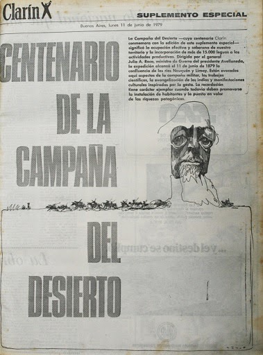 6 Por fuera de lo impulsado por el poder ejecutivo, hay una iniciativa que se destaca. Clarín, junto con su edición del lunes 11 de junio –el día del acto en Neuquén-, publica un suplemento especial dedicado al tema. No hay improvisación en esta intervención que hace más de un mes se anuncia y allí, tal como lo señala Marcelo Valko, halla un cómodo lugar un anuncio celebratorio de la Sociedad Rural. A página entera recuerda el servicio prestado por la entidad cuando era presidida por José Martínez de Hoz y el ministro de guerra solicitó su colaboración. Mil quinientos caballos puestos a disposición del gobierno nacional para hacer avanzar la frontera. Y remata: