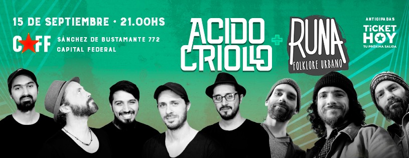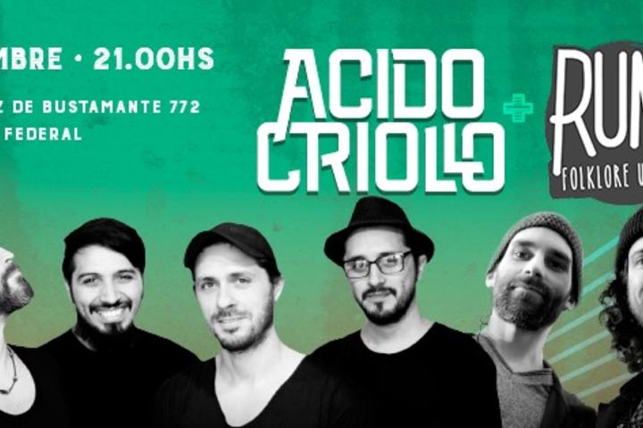 Dos bandas amigas se encuentran para compartir canciones, chacareras y zambas con una mirada desprejuiciada y natural de sentir nuestra música. Desde el funk a la cueca, entre bombos legüeros, flautas y violas distorsionadas Ácido y Runa se dan el gusto de pasear por un repertorio que recorre clásicos del folklore como temas propios.