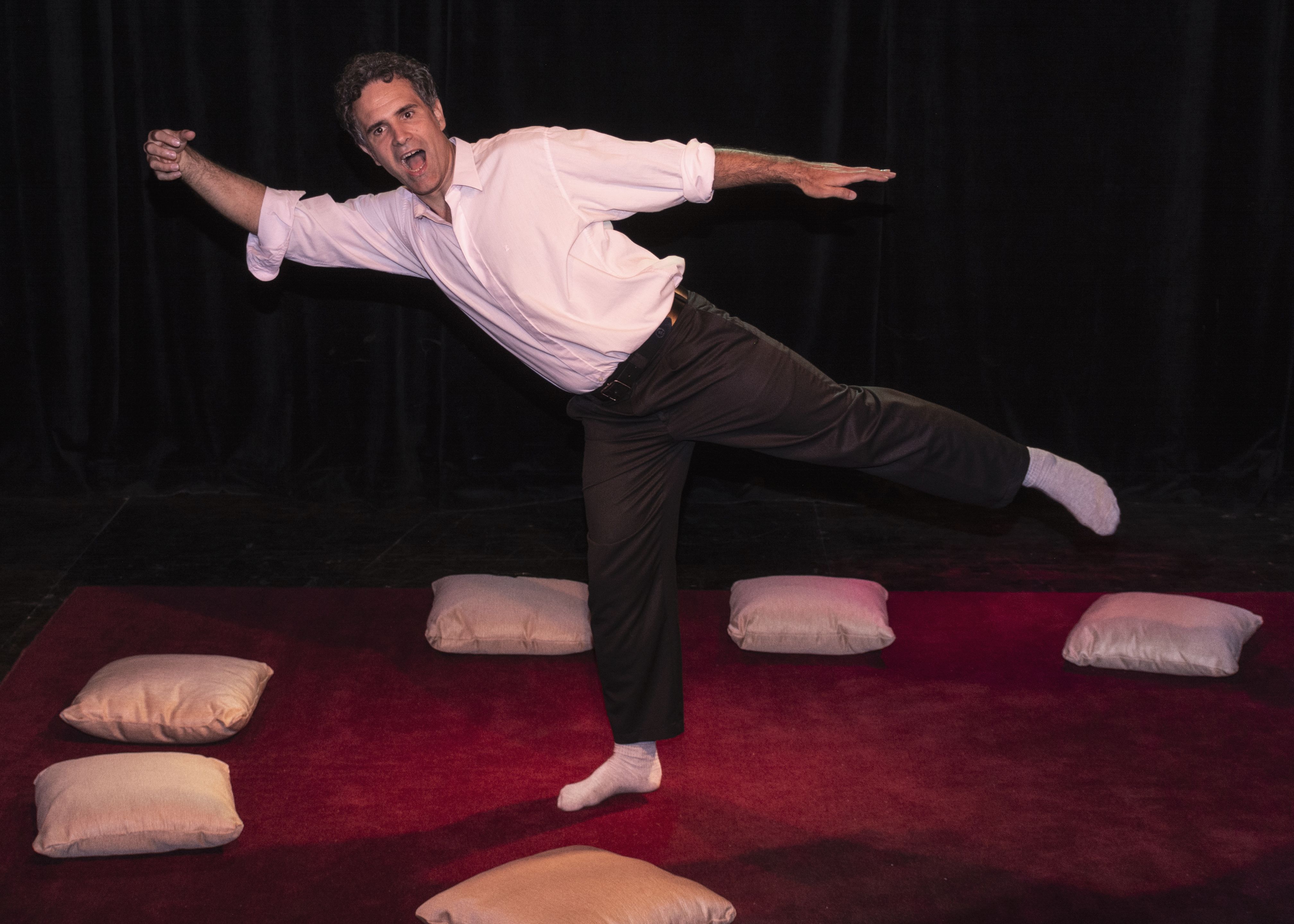 Una alfombra roja. Varios almohadones en ronda, varios pares de zapatos al costado. Un hombre en camisa blanca, pantalón gris y medias que es Tato Pavlosvsky y varios pacientes de la terapia grupal al mismo tiempo.