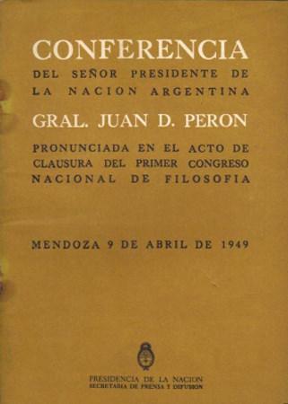 El Primer Congreso Nacional de Filosofía celebrado en la ciudad de Mendoza entre el 30 de marzo y el 9 de abril de 1949 fue clausurado por el General Juan Domingo Perón y su conferencia publicada luego bajo el título La comunidad organizada.