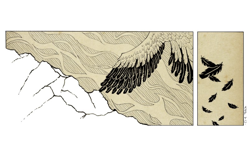 Los chicos siguen escuchando el relato del viejo. De repente, un puñado de plumas empieza a caer sobre sus pieles marrones y duras, y se gesta entre ellos un alboroto inusual, una mezcla de movimientos y ademanes alegres que los chicos nunca podrían explicar (al menos en ese momento), pero que atraviesa sus corazones y aflora por sus caras. El semblante del viejo ha cambiado, y ahora permanece con expresión jubilosa. Deja que pasen unos segundos y eleva una mano. Los chicos se calman inmediatamente.