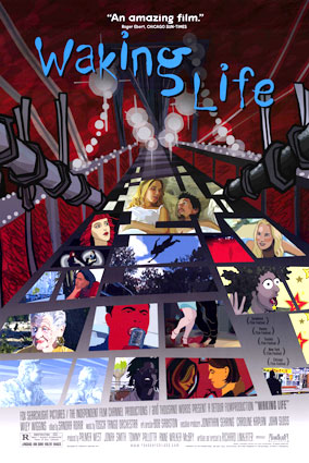 Waking Life (se puede ver la película acá), una historia sin historia, definiciones filosóficas fragmentarias sobre la vida, los sueños, las relaciones humanas y algún atisbo poético con estéticas visuales diversas. Mediante la técnica de rotoscopía, donde sobre las imágenes se generan efectos visuales, se opera una gama de estéticas ampliamente desarrolladas dando como resultado una película de animación tan variada como la historia del arte; el lienzo, la acuarela, el cubismo etc. así transcurre Waking life, en el que su personaje anónimo varía, de uno en uno, un compañero igual de anónimo, en una secuencia de reflexiones sobre los problemas humanos en un mundo de soñadores o, más bien, un soñador soñando soñadores. Atrapado en esa lucidez onírica sin narración, (difícil en este tipo de arte) la muerte de las grandes historias obliga a su director Richard Linklater a pensar un arte más sintético y variado dentro del formato del largometraje, destrozando por completo el guión convencional. La falta de narrativa es inversamente proporcional a la tensión que mantiene al personaje en esta encrucijada espacio-temporal con la realidad, se trata de un personaje que no puede dejar de soñar, y sus sueños son inmensas fuentes de pensamiento.