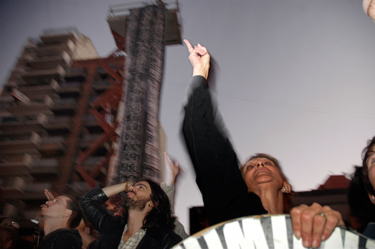 El armatoste está clavado en medio de la movilización más grande que los organismos de derechos humanos hayan realizado hasta ese momento. Es 18 de marzo del año 2006, ya caída la noche, y varios días antes había circulado un volante de convocatoria, con fecha y domicilio, para escrachar al dictador. Calculan unas 10 mil personas.
