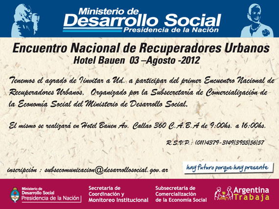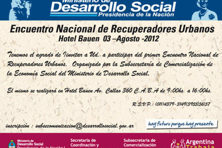 El viernes 3 de Agosto, de 9:00hs a 16:00hs se realizara el 1º Encuentro Nacional de Recuperadores Urbanos en el Hotel Bauen, Av. Callao 360, Ciudad Autónoma de Buenos Aires.