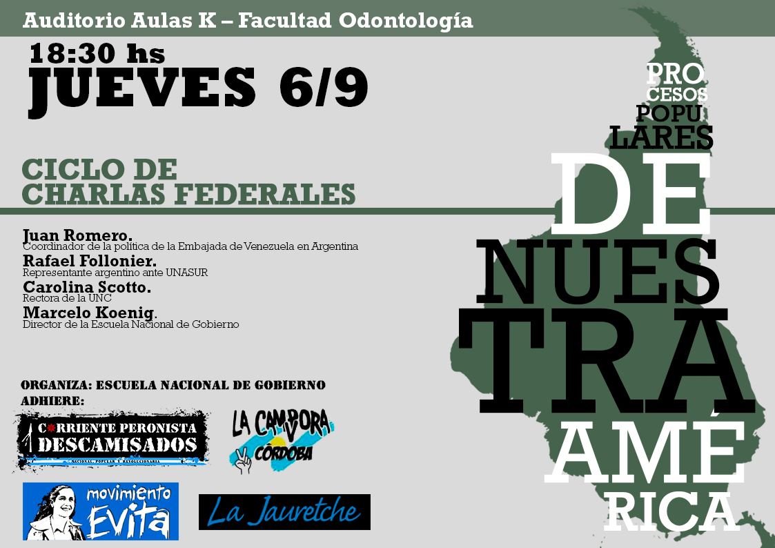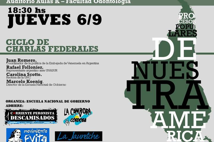 El Jueves 6 de septiembre, a las 18.30, tendrá lugar en el Auditorio Aulas K - Facultad Odontología, Córdoba Capital, un nuevo capítulo del Ciclo de Charlas Federales: "Procesos Populares de nuestra América". Participarán Juan Romero, Coordinador de la política de la Embajada de Venezuela en Argentina, Rafael Follonier, Representante argentino ante UNASUR, Carolina Scotto, Rectora UNC, Marcelo Koenig, Director de la Escuela Nacional de Gobierno.