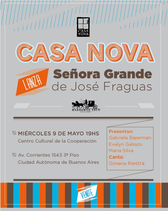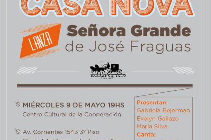 Se presentará Señora Grande de José Fraguas, el segundo título de la Colección Barranca Yaco (Editorial Casa Nova), dedicado a la nueva narrativa argentina. Será este miércoles 9 de mayo a las 19 hs. Centro Cultural de la Cooperación (Corrientes 1543 3° piso). Presentan Gabriela Bejerman, Evelyn Galiazo y María Silva. Canta Gimena Riestra.