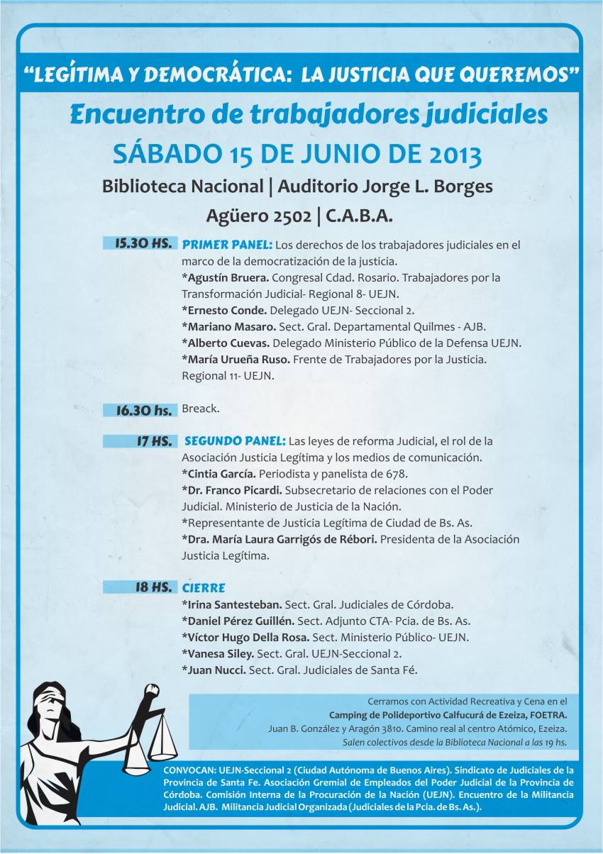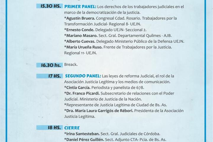 Convocan entre otros: UEJN-Seccional 2 (Ciudad Autonoma de Buenos Aires), Sindicato de Judiciales de la Provincia de Santa Fe, Asociación Gremial de Empleados del Poder Judicial de la Provincia de Córdoba, UEJN-Comisión Interna de la Nación, Encuentro de la Militancia Judicial, AJB, “Militancia Judicial Organizada” (Judiciales Pcia. De Buenos Aires).