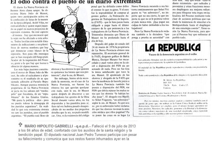 Por Diego Kenis I El martes pasado, como informó Agencia Paco Urondo, falleció en Bahía Blanca a los 84 años el periodista Mario Gabrielli. En mayo, los fiscales Miguel Palazzani y José Nebbia habían solicitado la detención e indagatoria de Gabrielli y de Vicente Massot por encontrarlos partícipes del plan criminal de la última dictadura desde el diario bahiense La Nueva Provincia, que primero reclamó el golpe, luego aplaudió y exigió la profundización del aparato represivo y posteriormente se ha dedicado, hasta nuestros días, a justificar lo actuado. Pero las notas publicadas por entonces en el matutino no se limitaban a ello, sino que incluían también la estigmatización del sector de la población que sería víctima del genocidio y la distorsión de cada hecho, lo que suponía la presentación de las masacres como enfrentamientos y la reproducción de documentos e informaciones específicas que sólo podían tener como fuente al propio aparato represivo. Gabrielli era secretario de redacción del diario y el hoy director Massot uno de los copropietarios, junto a su madre Diana Julio y uno de sus hermanos, Federico.