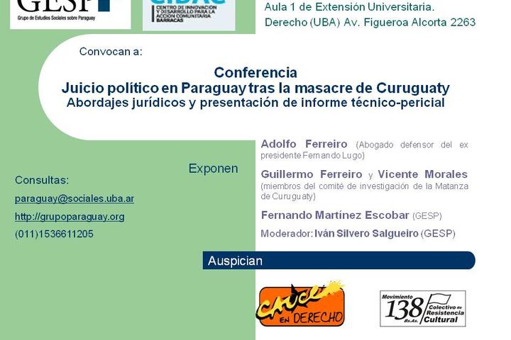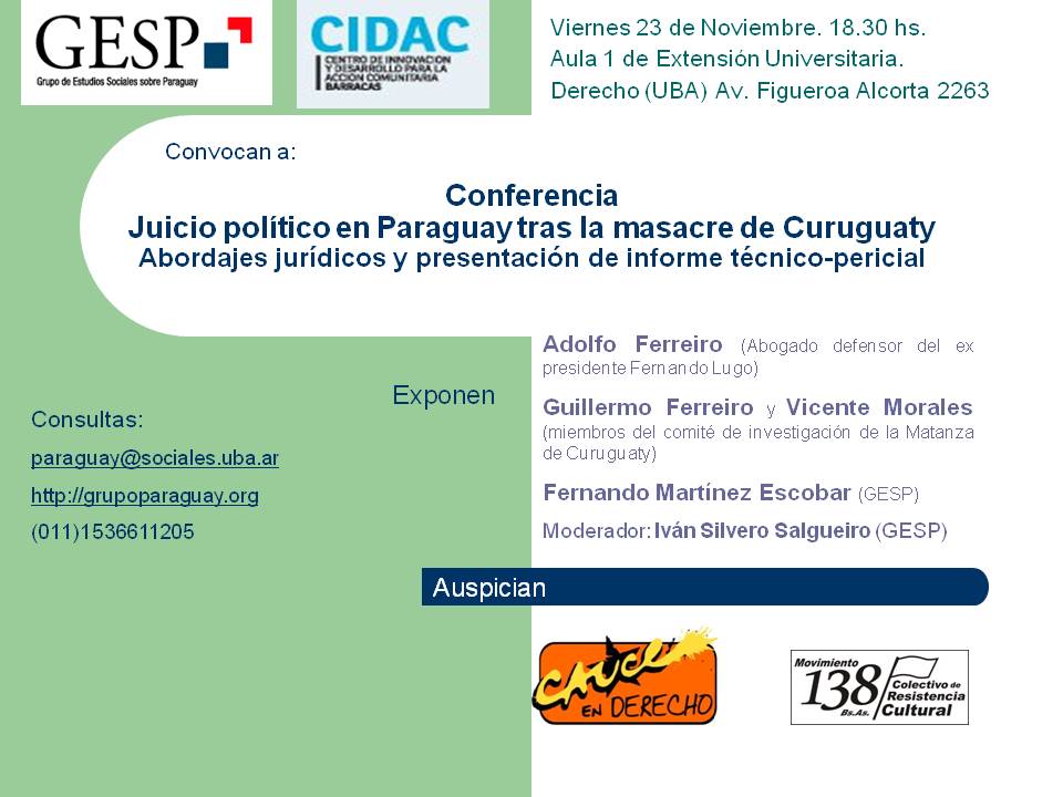 El Grupo de Estudios Sociales sobre Paraguay, convoca a todos los interesados a debatir sobre estos sucesos tras haberse dado a conocer el informe sobre la Masacre de Curuguaty, mediante el cual con diversas estrategias de investigación y con cuantiosa evidencia se demuestra que el Informe oficial omite hechos relevantes y sin evidencia culpabiliza a los campesinos. En la charla expondrán Adolfo Ferreiro (Abogado defensor del ex presidente Fernando Lugo), Guillermo Ferreiro y Vicente Morales (miembros del comité de investigación de la masacre de Curuguaty y defensores de los campesinos acusados), y Fernando Martínez Escobar (GESP/CONICET). La moderación estará a cargo de Iván Silvero Salgueiro (GESP). Para acceder al informe final de investigación respecto a los sucesos ocurridos en Curuguaty, ingresar a https://www.dropbox.com/sh/z8ho8vx8bx00eeu/eCTeZ1XD6t