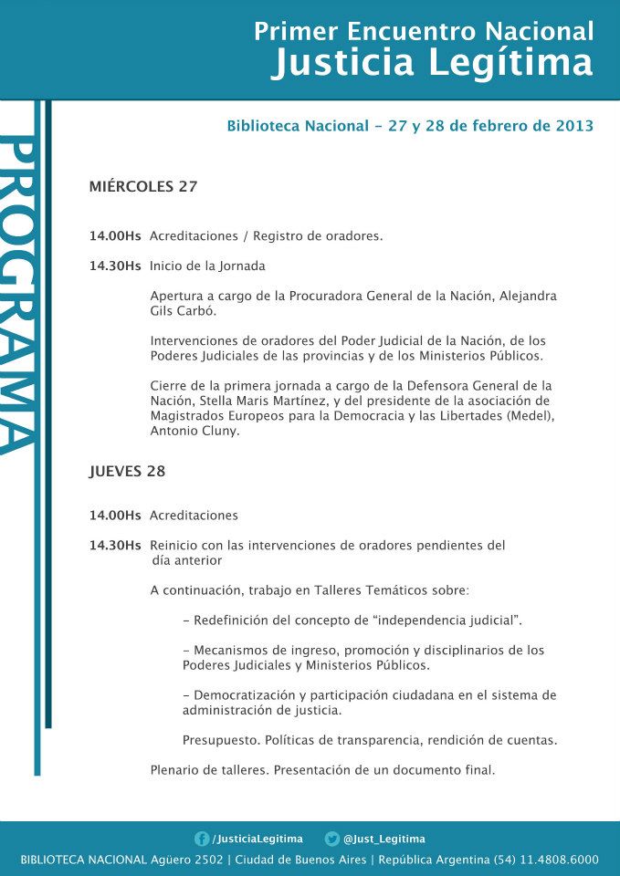 El 11 de diciembre de 2012, funcionarios judiciales y académicos firmamos la solicitada "Una Justicia legítima" en respuesta a la particular interpretación de preceptos constitucionales que realizaron, en un comunicado, la Comisión Nacional de Protección de la Independencia Judicial, la Junta Federal de Cortes, la Asociación de Magistrados y Funcionarios de la Justicia Nacional y la Federación Argentina de la Magistratura. Allí manifestamos que muchos de los firmantes del documento integramos algunas de esas organizaciones, pero no nos sentimos representados por el contenido del comunicado.