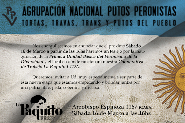 Comunicado I Nos enorgullecemos en anunciar que el próximo sábado 16 de marzo a partir de las 16hs haremos un festejo por la inauguración de la Primera Unidad Básica del Peronismo de la Diversidad y el local donde funcionará nuestra Cooperativa de Trabajo La Paquito LTDA.