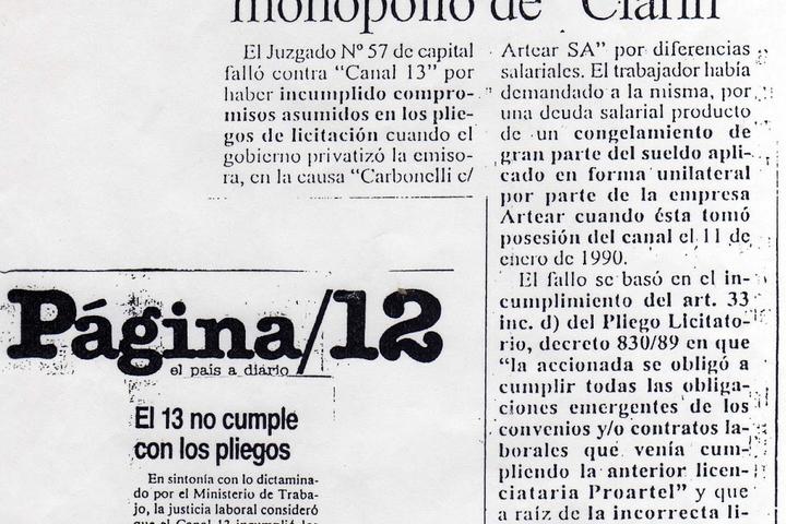 El 19 de mayo, Página/12 tituló “El 13 no cumple con los pliegos” al informar sobre aquella sentencia en la que los jueces afirmaban que ARTEAR S.A. no había cumplido los compromisos asumidos en los pliegos de licitación.