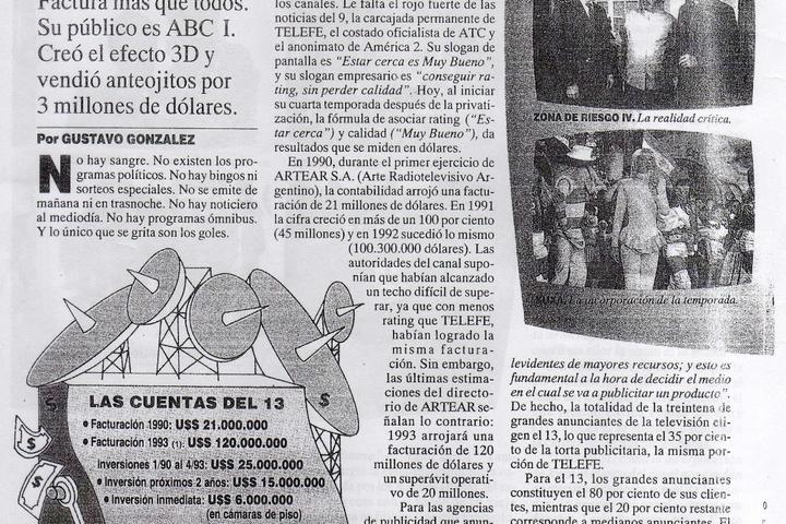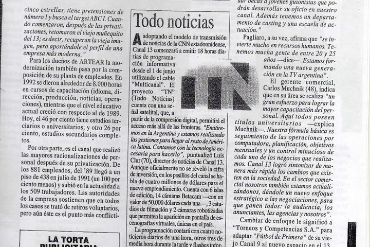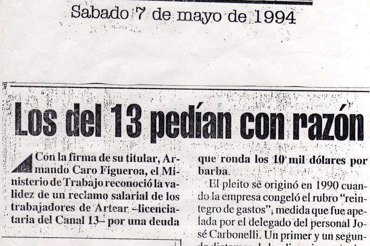 El 23 de mayo, el semanario Noticias publica una nota de 8 páginas titulada "Crecimiento de Canal 13. Muy cerca del pantallazo". Muy complaciente con el Grupo, sin embargo contenía un punto negro, una espinilla: Carbonelli aparecía dando la nota al destacar que "el fallo de la justicia laboral conocido en la última semana”, que “intima a la empresa a pagar sueldos mal liquidados".