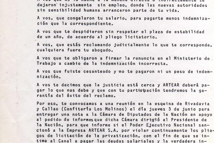 Las asambleas, medidas de fuerza, sentadas de trabajadores en la calle y paros de actividades habían ido in crescendo a pesar de que ARTEAR S.A. seguía despidiendo a la mayoría del personal que revistaba en el Canal 13 antes de que le fuera concesionado. Fueron más de 700 trabajadores cesanteados.