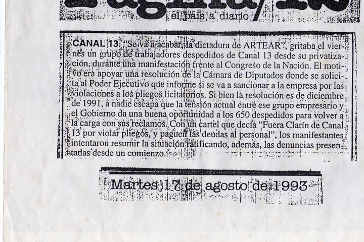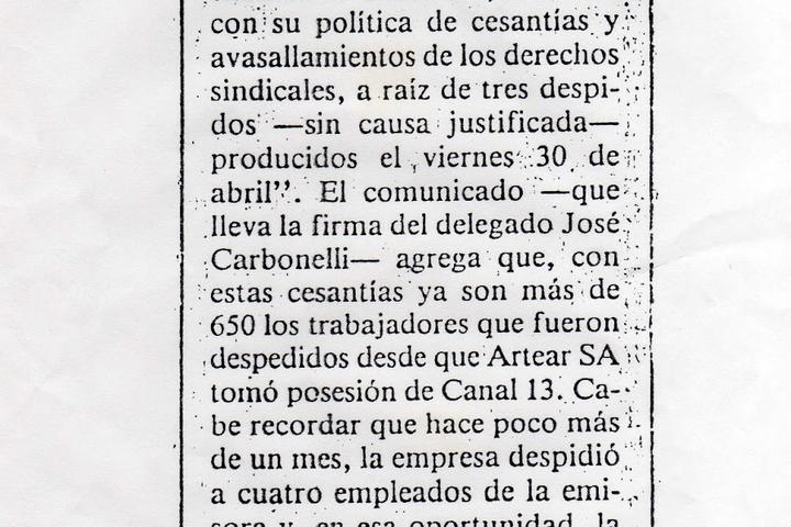 El día 12, Página/12 publico un suelto con el título “Despidos”. Se trataba de una síntesis de un comunicado de los trabajadores, que con la firma de Carbonelli reclamaban “el cese de los despidos y el pago de una deuda estimada entre 6 y 10 mil dólares por cada trabajador”.