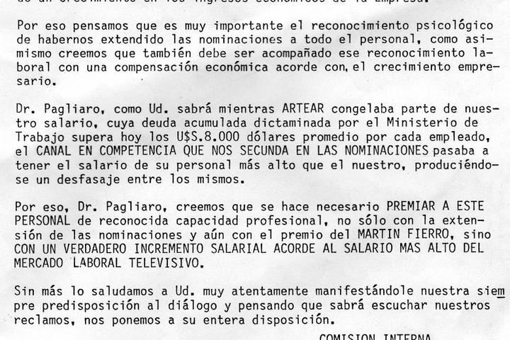 En mayo, el enfrentamiento recrudeció. El día 3 de ese mes el delegado Carbonelli reclama aumentos de salarios a través de una nota pegada en todas las secciones de la empresa, dirigida al Director del Canal, Lucio Pagliaro (uno de los dueños junto a Noble, Magnetto y otros) señalando en la misma “que si bien era muy importante haber reconocido la empresa a todo el personal por el éxito de haber obtenido mas nominaciones para el “Martín Fierro” que Canal 11, pero debería premiar al personal con un verdadero incremento salarial por al alta distinción obtenida.”