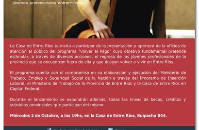 Este miércoles a las 19 hs. se realizará la presentación oficial del programa Volver al Pago, un proyecto articulado entre la Casa de Entre Ríos en...