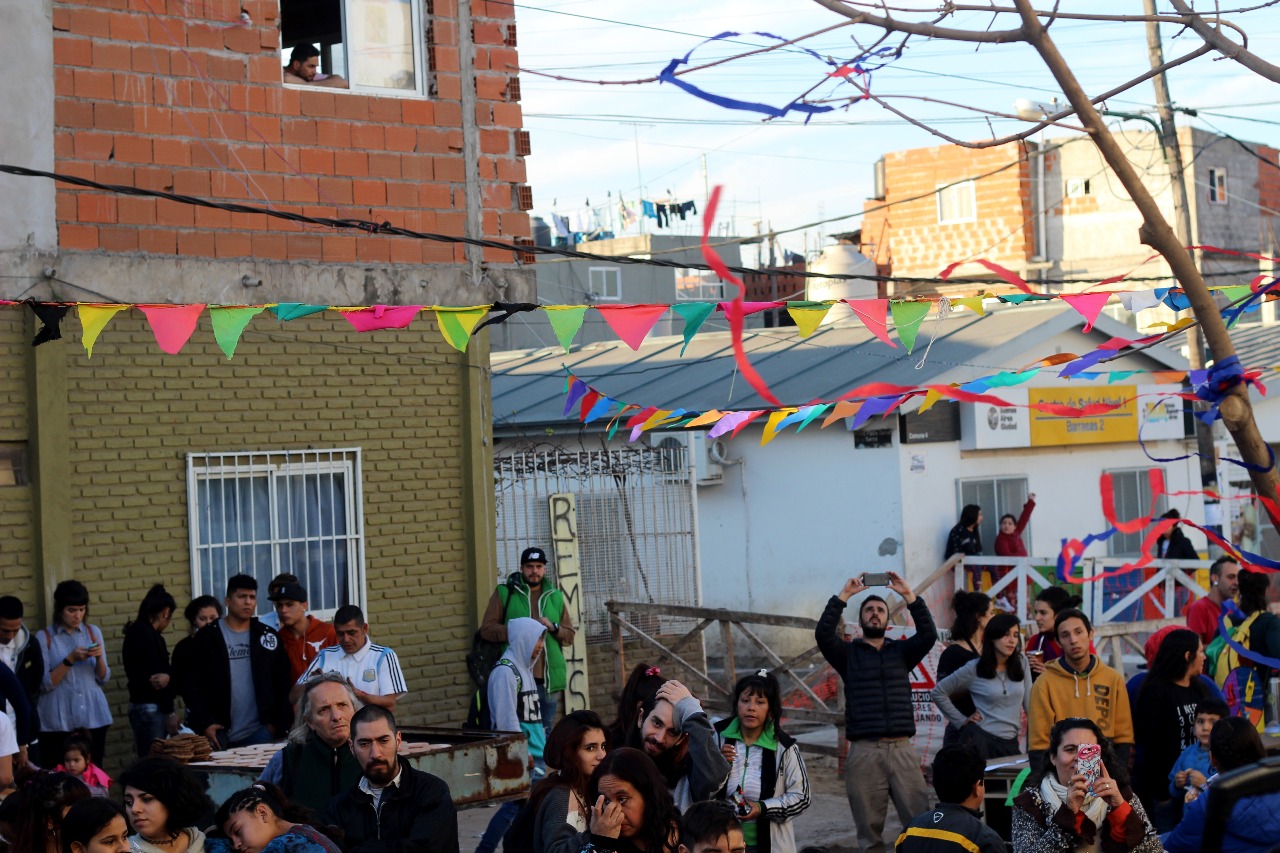 El festival a un año del asesinato de Paragüita se llevó acabo el sábado 14 de julio, frente a la capilla de la Caacupé y de la ferretería donde él trabajaba, en la villa 21/24. En esa cuadra hay una ermita. Su foto, con su perro, la camiseta. Ahí se juntan sus amigxs a diario. Un vecino pasa, la toca y se persigna. Hay juegos para niños y niñas y música. Merienda, jugo, bolsitas de juegos. Las remeras con la cara de Paragüita abundan. Leo, sus amigxs, su famila y vecinxs, llevan la remera con su cara. El clima es festivo, Paragüita era un pibe muy alegre, dicen -más de una vez- quienes lo conocieron, que pareciera son casi todxs en el barrio. La calle se vuelve espacio de encuentro en el festival por Paragüita. Esa calle que se vuelve espacio público con un sentido distinto en los barrios populares, de una vecindad que se palpita más cercana. En palabras del Padre Toto, cura villero que acompaña desde el comienzo la exigencia de justicia, “la villa da lección a gente de otros sectores sociales. El 50% de los habitantes de la villa tiene menos de 18 años, hay una población infantojuvenil y en la villa se vive el espacio público como un espacio de todos, de todos de verdad. Hay capacidad de hacer fiesta. Cosa que en muchos lugares no. Hay un sentido de vecindad, una madre es madre de sus hijos y de los del pasillo, lo que le pasa al de al lado me incumbe, me influye. Hay una solidaridad natural en la villa de la cual muchos otros barrios debieran aprender”.