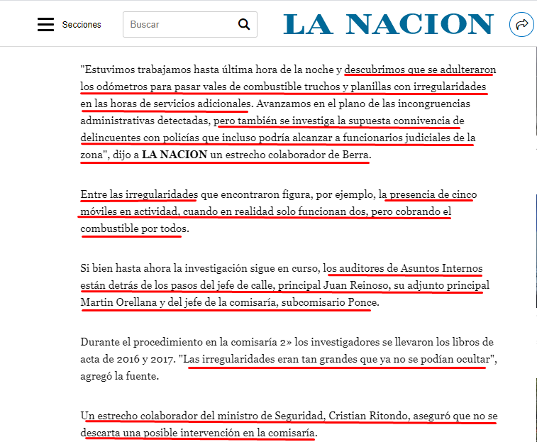 Según sostenía la nota Berra “abrió un sumario y dio curso a una investigación: hubo cruces de datos y anteayer requisaron la seccional y secuestraron documentación vinculada con el expediente y los libros de guardia de la seccional policial de Ramallo”. En otro párrafo decía: "Estuvimos trabajando hasta última hora de la noche y descubrimos que se adulteraron los odómetros para pasar vales de combustible truchos y planillas con irregularidades en las horas de servicios adicionales. Avanzamos en el plano de las incongruencias administrativas detectadas, pero también se investiga la supuesta connivencia de delincuentes con policías que incluso podría alcanzar a funcionarios judiciales de la zona", sostuvo a La Nación un estrecho colaborador de Berra, aunque la realidad era muy distinta.