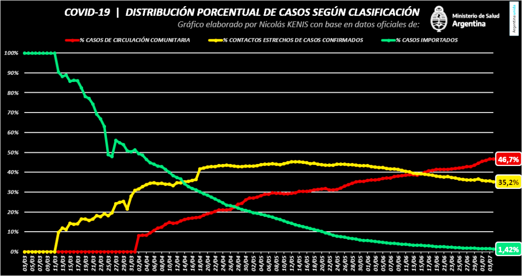 Del total acumulado, 1.069 son los casos “importados”, así denominados por vincularse con viajes al exterior por parte de los y las pacientes. Representan un 1,4% de incidencia sobre el total, porcentaje que verifica un descenso constante desde implementado el cierre de fronteras. En tanto, unos 26.548 (35,2%) se originaron por contactos estrechos con positivos previamente confirmados. La circulación comunitaria, desde el martes 16 la primera causa de propagación del virus en el país, suma 35.186 casos (46,7%). El resto se encuentra en investigación epidemiológica. El detalle de la evolución porcentual de esta clasificación desde el comienzo del brote puede visualizarse en el gráfico 3.