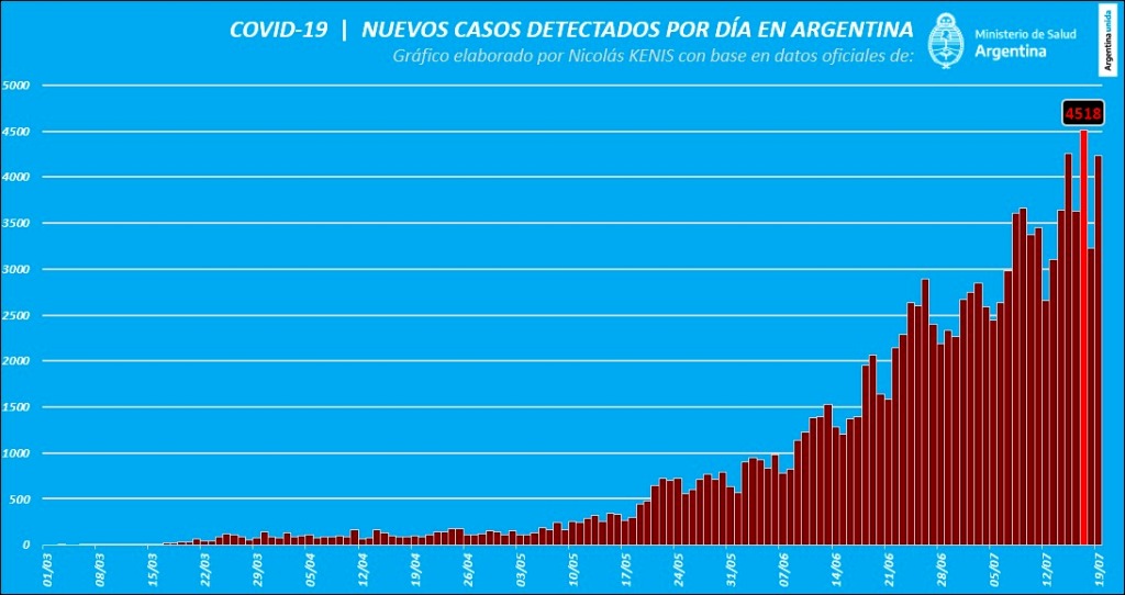 La actualización supera holgadamente al registro anterior, los 3.223 correspondientes al sábado 18. El récord diario continúa siendo el de 4.518 que informó AGENCIA PACO URONDO el viernes 17, siendo este domingo el que ocupa el tercer lugar entre los días con mayor cantidad de casos. Los registros desde el comienzo del brote se detallan en el gráfico 1.
