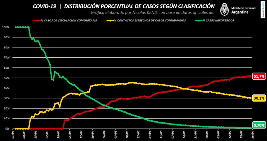 - la circulación comunitaria -desde el 16 de junio, la primera causa de propagación del virus en el país- cuenta 81.828 contagios (51,7%).