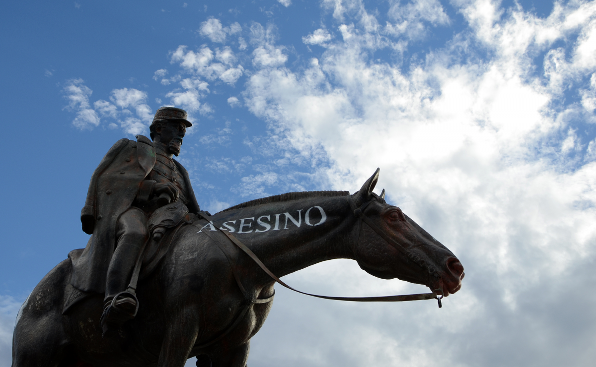 La indignación golpea. Vanesa se indigna por el esfuerzo que ponen en borrar las intervenciones de la estatua. Limpiar, lavar la imagen para que siga brillando el discurso genocida. Pero, ¿se puede borrar la sangre?
