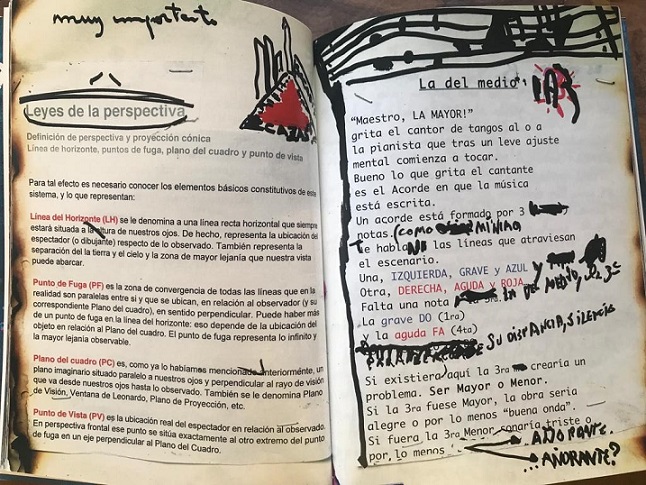 11. En mi modesta opinión, su carrera de pintor alcanza su momento más alto en el recital que da en el Teatro Colón en el año 2013, la coda domesticada de una vida en ebullición. En verdad no es en el recital ni en el programa que repartían ese día en el teatro (un cuadernito negro muy prolijo), sino en el libro que publicó la editorial Planeta. Como el concierto, el libro también se llama Líneas paralelas (artificio imposible). Allí declara dos influencias, Dadá y Merz. En sus páginas vemos desplegado todo el arte del rayón, la mancha, la fotografía intervenida, el collage con fotos de películas, la escritura de comentarios y canciones mezclándose con la figuración y los colores salvajes que ponen en peligro la inteligibilidad de la imagen y del texto verbal —algo parecido sucede en el cd Random, por ejemplo, donde también las pinturas están atribuidas a Charly García. De hecho, el editor se excusa diciendo que así son los artistas, imprevisibles, incontrolables… y que para Charly García, si algo no se entiende, bueno, que no se entienda. He aquí la idea pop articulando toda la obra. Hay que entender que no todo puede entenderse. Para colmo, el cuaderno original se quemó con la estufa mientras estaban tratando que la pintura se secara. Lo salvaron de casualidad, aunque algunas hojas están chamuscadas.