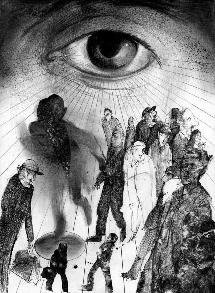 L.S.: La Ilustración la entiendo como una especie de amplificación de la lectura. Primero leo el libro en su totalidad, después empiezo a trabajar con la memoria, a recordar qué partes se quedaron pegadas. Y a partir de ahí trabajo plásticamente. Muchas veces, lineal con lo descripto, con lo narrado; y otras son metáforas de eso. En esta historia hay mucha violencia de todo tipo. Los dibujos giran en torno a esa violencia. Los ojos mecánicos que circulan en 1984 son collage. Cuando leí, pensé: “Acá hay ojos que nos están mirando”. Tenía unas fotos hermosas de ojos de vidrio, de alguien que fabricaba muñecas en otra época. Las tuve guardadas por lo menos 20 años para una ocasión. Esa ocasión llegó.