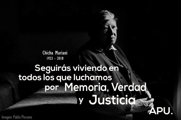 "Despedimos con enorme tristeza a quien fuera compañera de Abuelas de Plaza de Mayo y actual presidenta de la fundación Clara Anahí. Una mujer fundamental en los inicios de la búsqueda de los niños y niñas apropiados por el terrorismo de Estado y un símbolo de la lucha por los derechos humanos", comenzó el comunicado de Abuelas de Plaza de Mayo donde despiden a María Isabel "Chicha" Chorobik de Mariani, una de las 12 fundadoras de Abuelas.