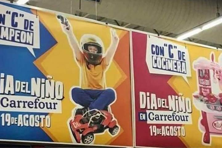 A una semana del debate en el Senado por la legalización del aborto, en una de las sucursales del hipermercado Carrefour pusieron un cartel publicitando sus juguetes para el próximo día del niño (y la niña). El cartel consta de dos recuadros: a la izquierda se ve un niño con un casco puesto, los brazos en alto y un auto de karting a los pies; a un costado se lee: “Con “C” de Campeón”. A la derecha, una niña vestida de cocinera sonríe entusiasmada detrás de su cocinita rosada y puede leerse: “Con “C” de Cocinera”.