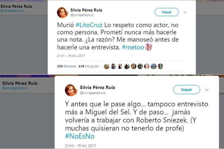En su perfil de la red social Twitter, la periodista expresó: "Murió Lito Cruz.Lo respeto como actor, no como persona. Prometí nunca más hacerle una nota. ¿La razón? Me manoseó antes de hacerle una entrevista. #metoo". Asimismo, en otro tweet, manifestó: "Y antes que le pase algo... tampoco entrevisto m{as a Miguel Del Sel. Y de paso... jamás volvería a trabajar con Roberto Sniezek. (Y muchas no quisieran tenerlo de profe) #NoEsNo".