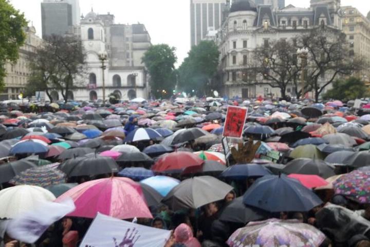 A partir de las 17, la concentración se nucleó en el Obelisco para marchar hacia la Plaza de Mayo. Las fotos aéreas fueron contundentes para mostrar el nivel de movilización: la Avenida de Mayo repleta, incluyendo la plaza y sectores de la Avenida 9 de Julio. Además de "Ni una menos" y "Vivas nos queremos", se vieron consignas reclamando "Aborto legal, seguro y gratuito" y cantos denunciando complicidad policial en casos de violencia de género: "yo sabía/que a los violadores/los cuida la policía".