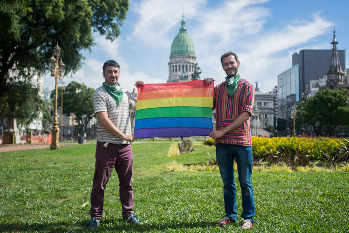A. A.: Sí, vino a raíz de que muches compañeres nos manifestaron que no se sentían incluides, entonces la necesidad de visibilizar la disidencia sexual se volvió necesidad de organización. También mencionar que no es coyuntural, sino que hay antecedentes de una alianza estratégica del colectivo LGBTIQ con los movimientos de mujeres a lo largo de la historia, como ser desde la década del 70 con la interrupción de la dictadura cívico militar, pasando por los 80, y su máxima expresión en la década del 90 con la derogación de los edictos policiales. Una alianza clave también contra las persecuciones de las personas en situación de prostitución tanto trans como mujeres por parte de la policía. Estos antecedentes sirvieron para potenciar la batalla por la Ley de Identidad de Género y el Matrimonio Igualitario. Todas estrategias políticas que aunaron fuerzas y dan cuenta hoy de este momento en que Argentina viene de una construcción política de vanguardia en la conquista de derechos. Bueno, el derecho al aborto se inscribe en esa línea histórica, por eso surge de ahí también nuestra necesidad de hacernos visibles.