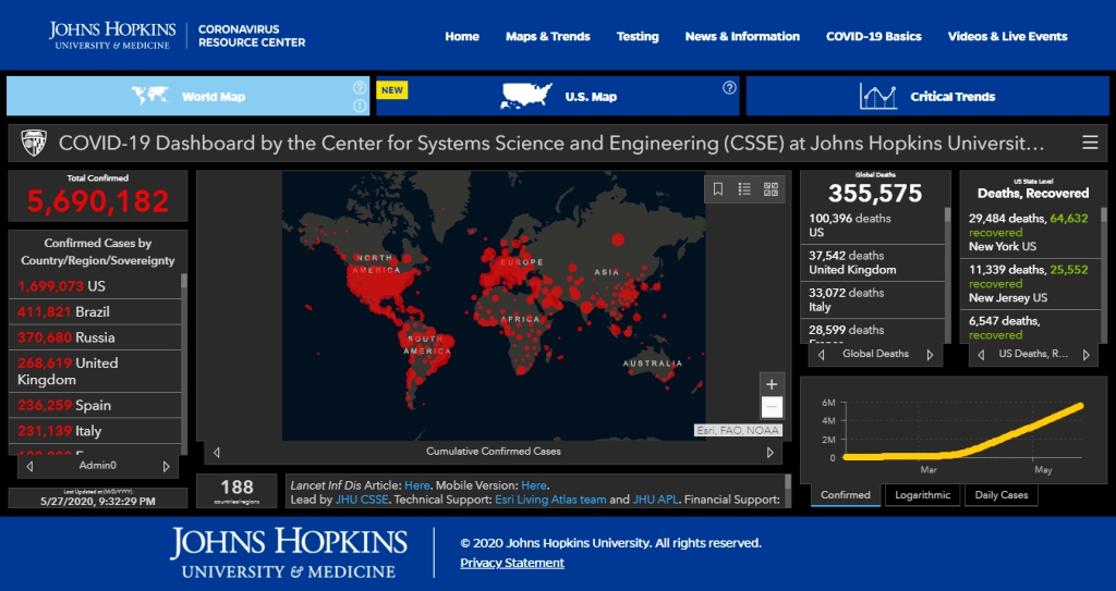 Esto ocurre en un contexto en que, según datos de la Universidad Johns Hopkins (con actualización a las 21:32 de este miércoles), la población infectada a nivel mundial asciende a 5.690.182. Estados Unidos tiene un 30% del total global y encabeza los registros con 1.699.073 casos. Brasil se encuentra en segundo lugar, superando hoy los 400 mil (411.821) y en tercer lugar se ubica Rusia (370.680). Un poco más atrás quedaron otros países europeos, que sufrieron fuertemente los efectos de la pandemia, como Reino Unido (268.619), España (236.259) e Italia (231.139).