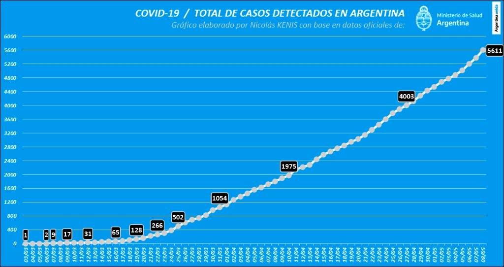 Con el informe, fueron confirmados 240 nuevos diagnósticos positivos para el virus SARS CoV-2, causante de COVID-19. Se trata del número más alto de casos registrados en un día desde que comenzó el brote de la enfermedad en nuestro país. De esta manera, se superan los 188 que, como informó AGENCIA PACO URONDO, se produjeron el miércoles 6. En la víspera, fueron 163. Los registros diarios de infectados desde que se registró el primero, el 3 de marzo pasado, se detallan en el gráfico 1.