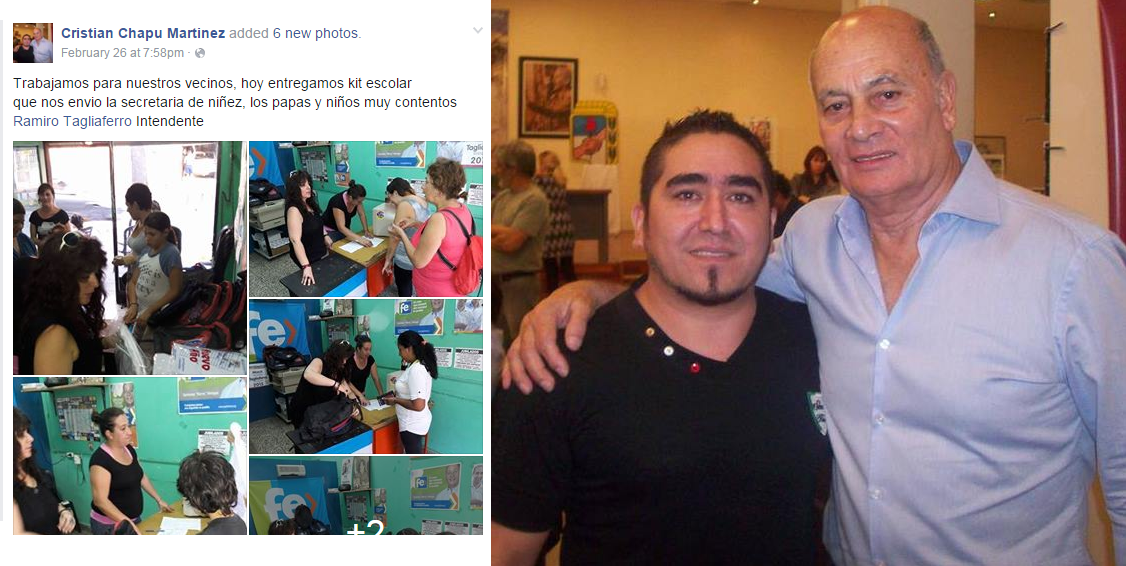 Cristian "El Chapu" Martínez es el Secretario de la Juventud del Partido FE en Morón. En su página personal de Facebook, Martínez publica fotos de la entrega de kits escolares (mochilas, guardapolvos y útiles) en un local de su partido. Estos recursos son normalmente entregados de manera directa por el municipio. Junto a las fotos, Martínez aclara: "Trabajamos para nuestros vecinos, hoy entregamos kit escolar que nos envio la secretaria de niñez, los papas y niños muy contentos Ramiro Tagliaferro Intendente" (sic).