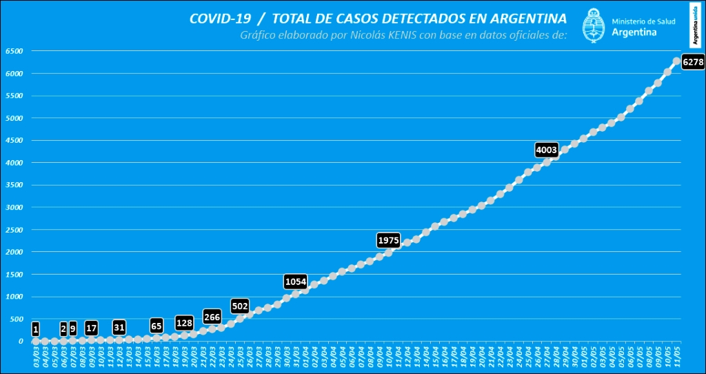 Con el número del día, como puede verse en el gráfico 2, nuestro país acumula un total de 6.278 casos de coronavirus desde el comienzo del brote de COVID. Las principales franjas etarias afectadas por la enfermedad son las de personas de entre 20 y 59 años y la edad promedio es de 41, afectando en partes iguales a hombres y mujeres.