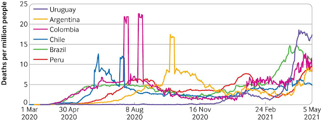 El caso de Uruguay resulta quizás el más paradigmático de esta situación ya que pasó de un vértice al otro, de la menor incidencia a la más alta, y por eso el informe se detiene particularmente allí. "Uruguay registró el número más bajo de casos per cápita en América del Sur en 2020 como resultado de las pruebas generalizadas, el rastreo rápido de contactos y el fuerte cumplimiento público del distanciamiento social. Pero el 22 de abril de 2021 registró 22,17 muertes diarias por cada 100 000 personas, la tasa más alta de la región."